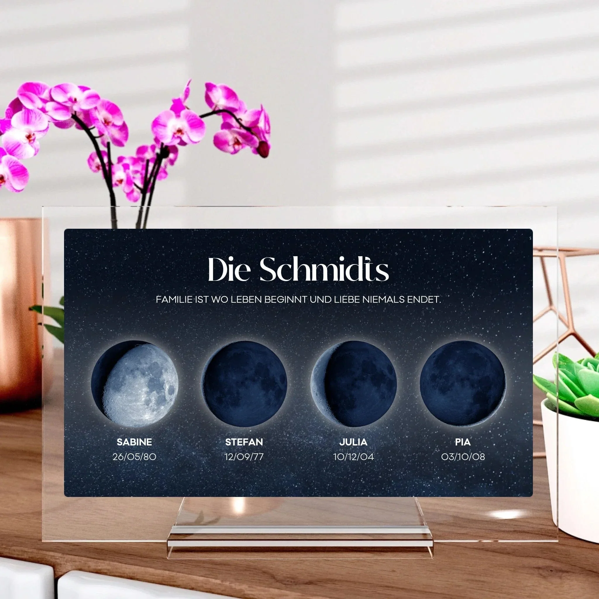 Manche Augenblicke sind einfach magisch – der erste Kuss, die Geburt eines Kindes oder der Tag, an dem ihr euch begegnet seid. Wäre es nicht wunderschön, genau diesen Moment in einer ganz besonderen Form festzuhalten? Mit unserem personalisierten Mondphasen-Aufsteller kannst du die Mondphase eines bestimmten Datums an einem bestimmten Ort verewigen. Ein einzigartiges Kunstwerk, das eure Geschichte auf ganz besondere Weise erzählt – für dich, für deinen Lieblingsmenschen oder für die ganze Familie.